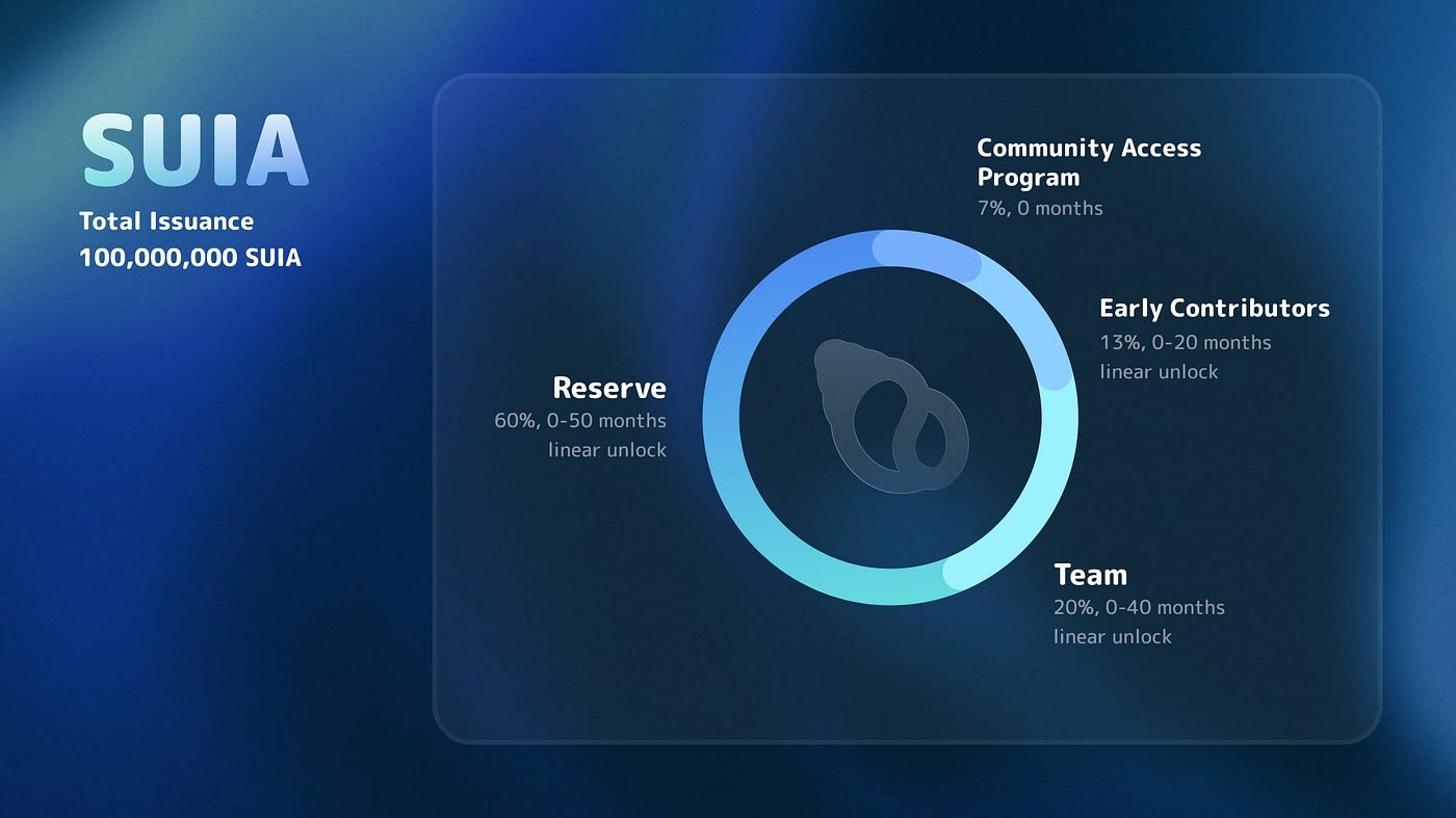 There will be 100 million total SUIA tokens(no inflation), and the distribution is as follows: